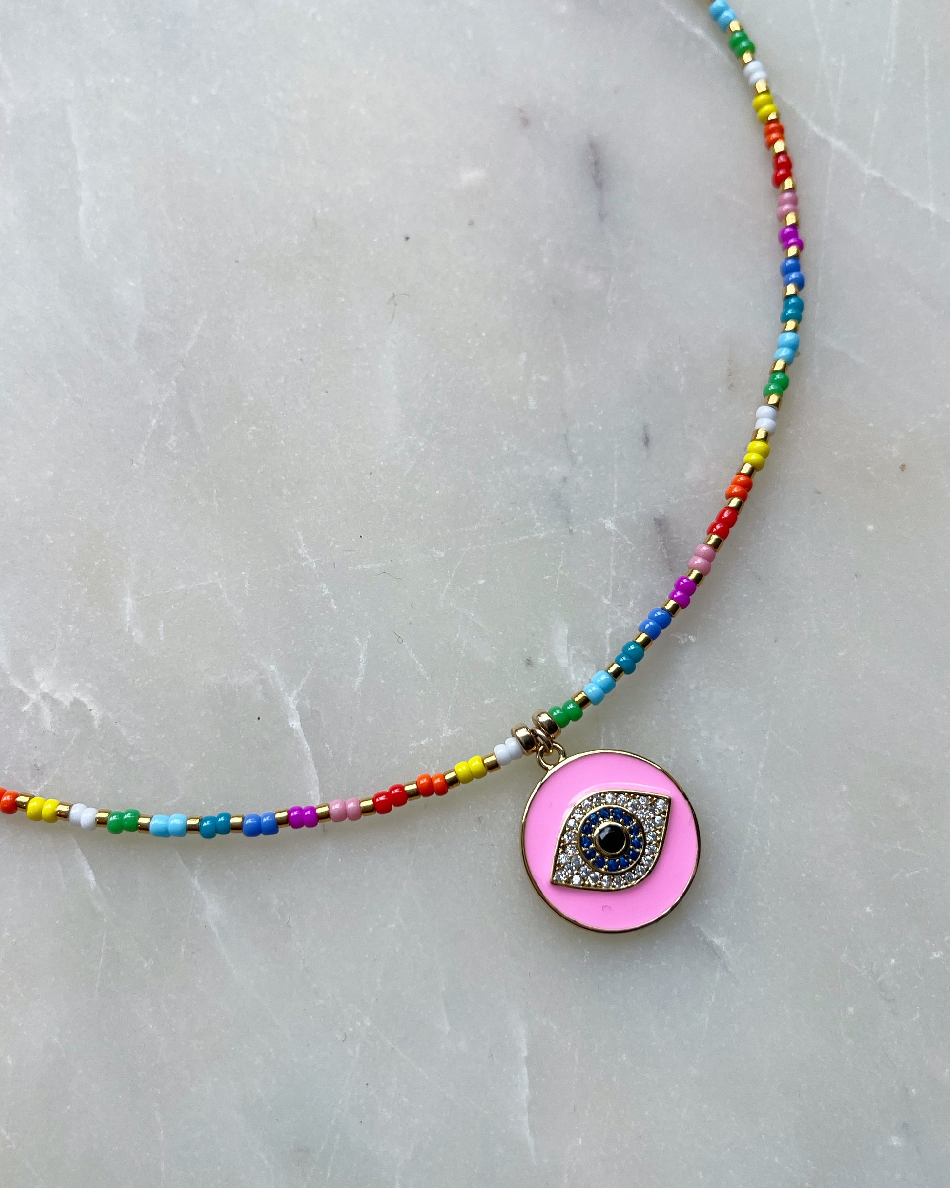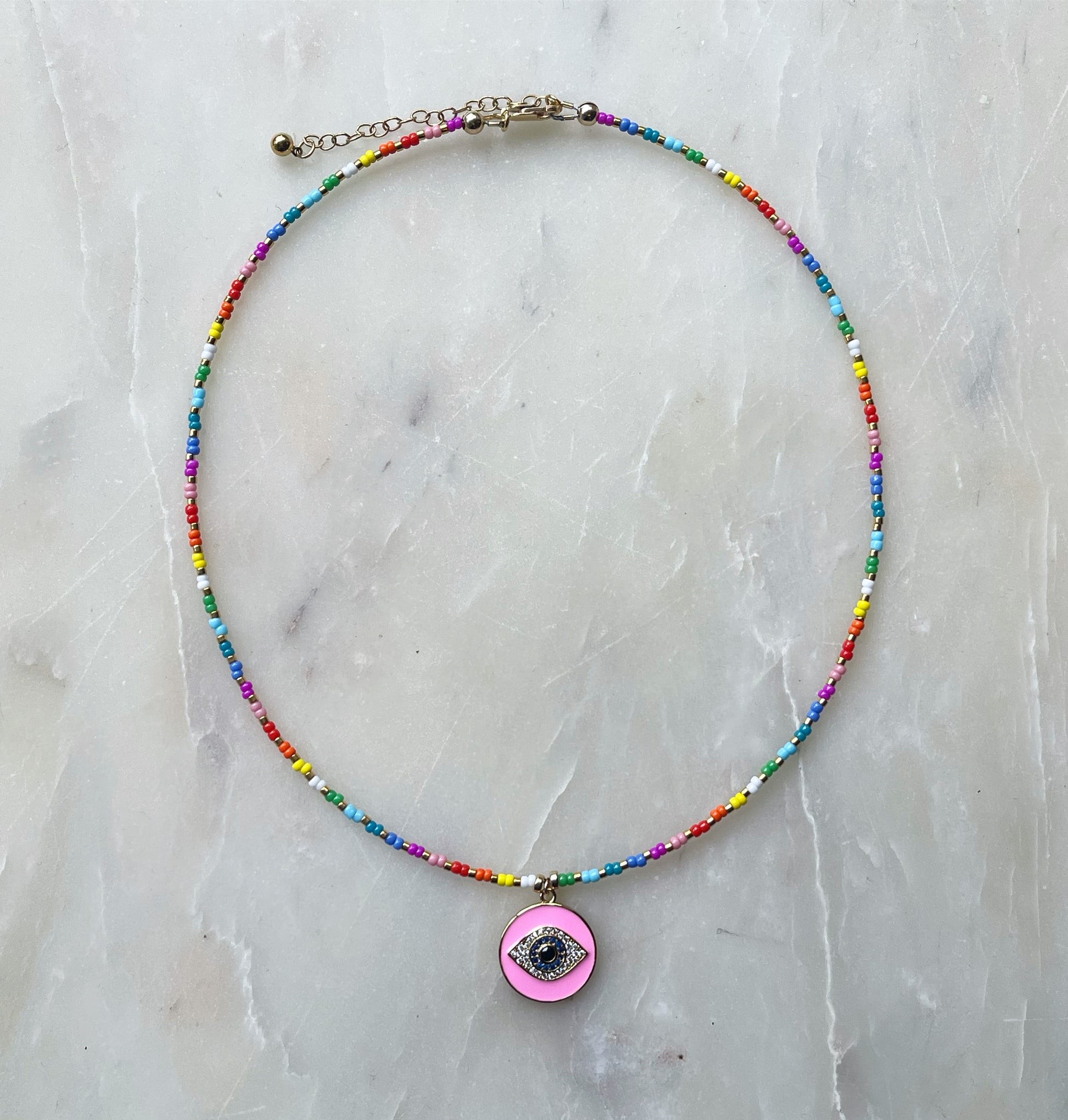Fluro pink enamel Eye hangs in the centre, Worn as a symbol of Protection and to repel negative energy.