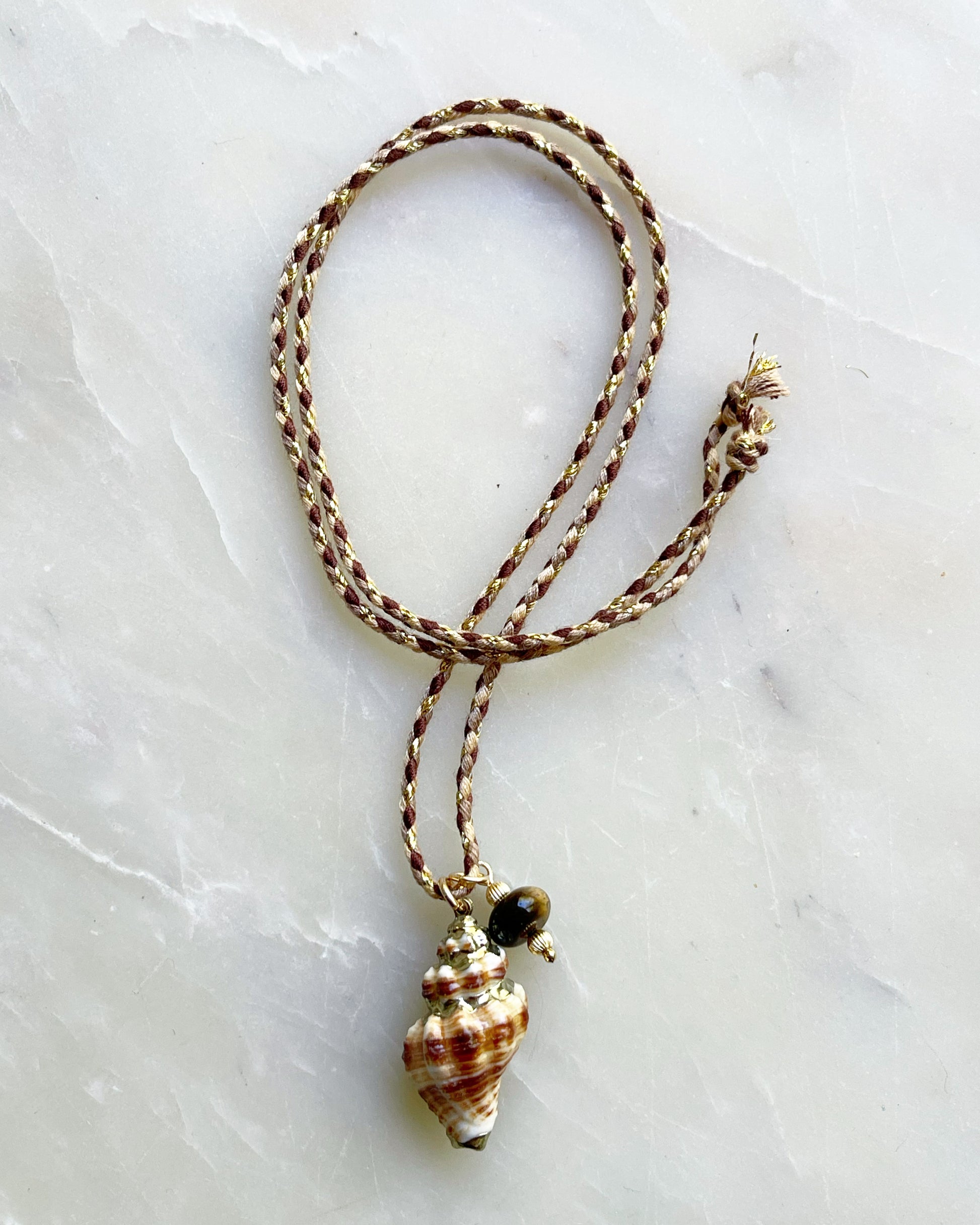 Beautiful shell with tigers eye stone on woven cotton thread 50 cm in total cord length